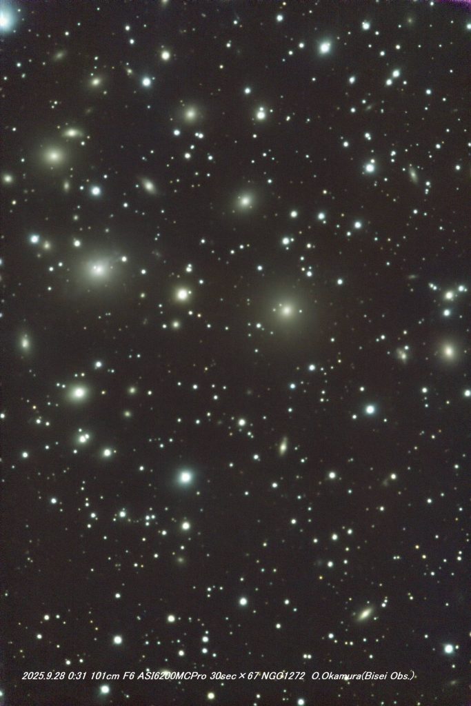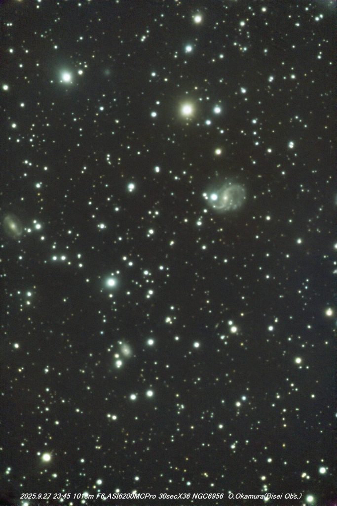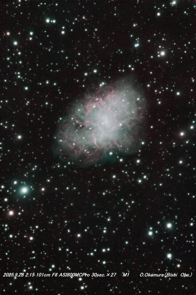 公募観測成果報告 (2025年9月28日) 2025年10月6日 最終更新日時 : 2025年10月6日 ItohRyosuke 観測者氏名岡村 修観測日2024年9月27日~28日観測装置西フォールデッドカセグレン 焦点 + ASI 6200MC Pro M1かに星雲 NGC1272 (ペルセウス座銀河団) NGC6956 棒渦巻銀河 Share Twitter Facebook Line Email